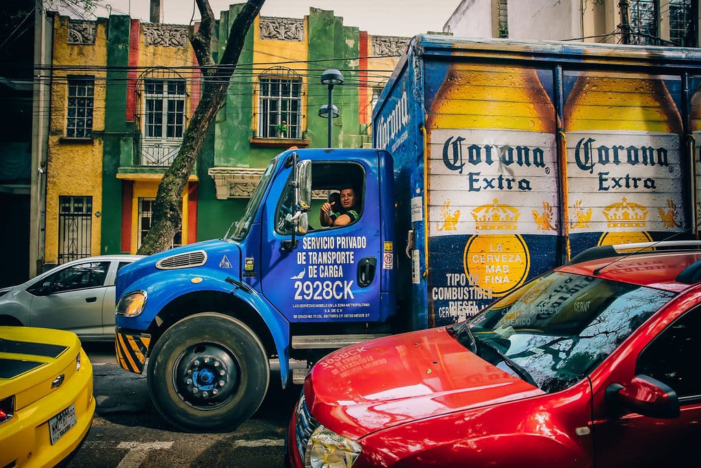 Amidst a colorful backdrop of vibrant houses, a friendly Mexican beer transporter, reflecting the lively spirit of Mexico’s streets and the joy it brings to people’s lives.