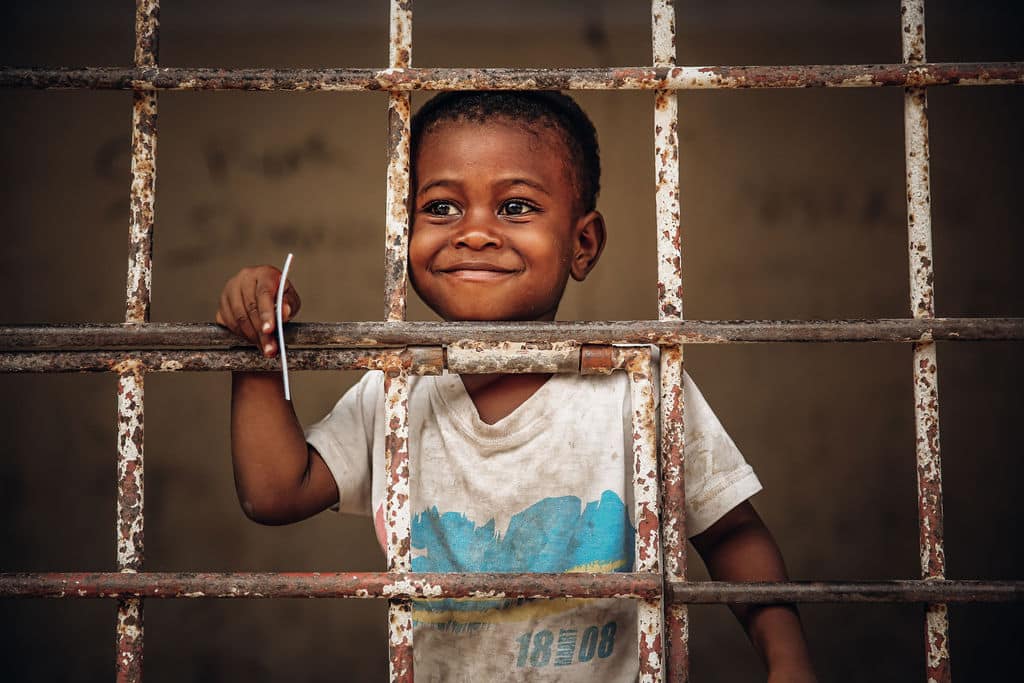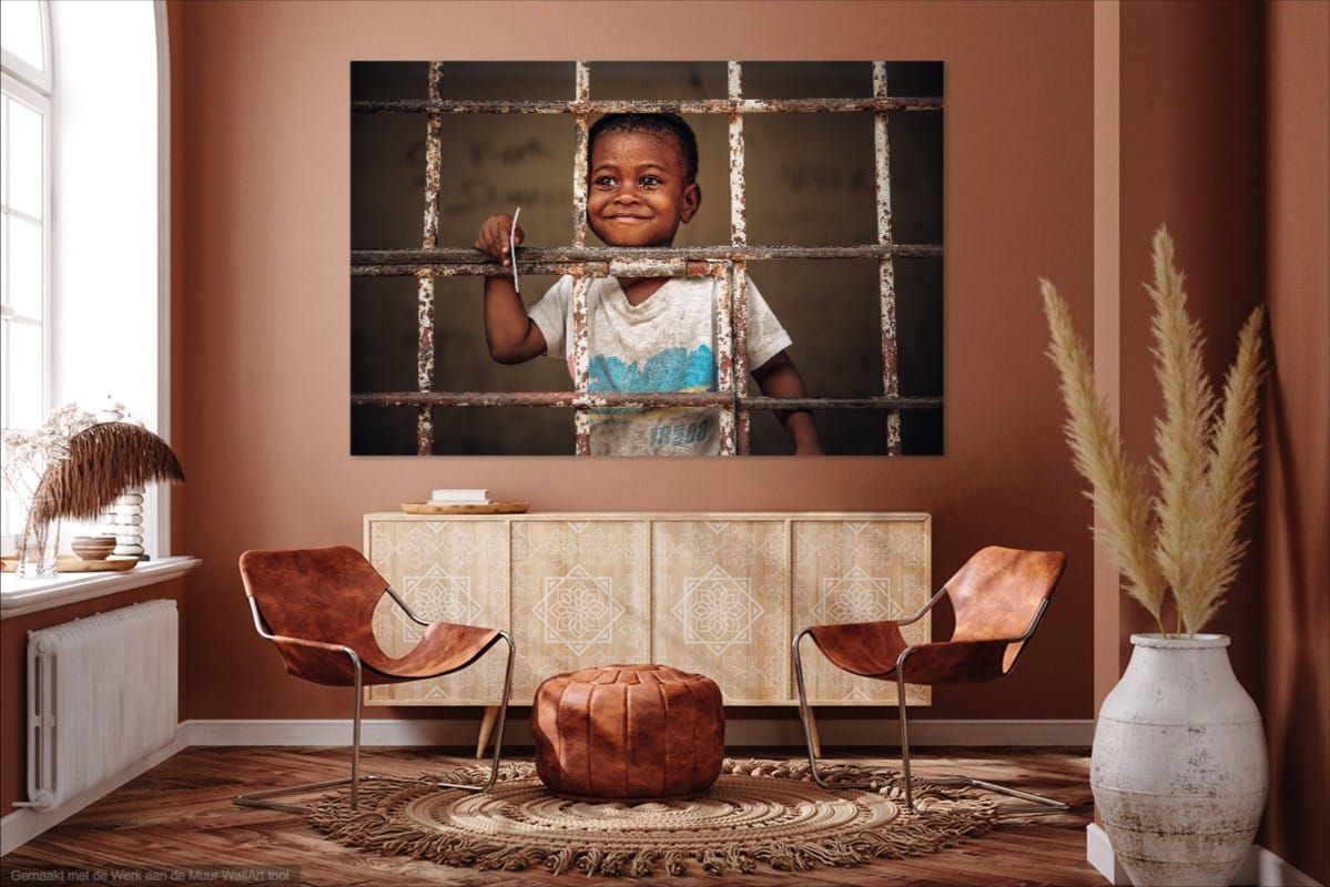 Maximum 200 pieces available – A Swazi boy’s smile shines through a metal grate, embodying warmth and kindness that transcends barriers.