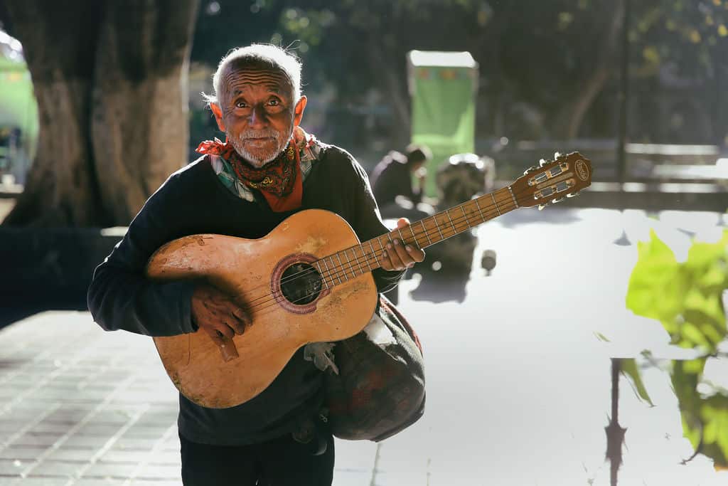 A charming elderly Mexican man, playing his guitar on a square. Playfully engages with the camera, his music reflecting a lifetime of stories and joy.