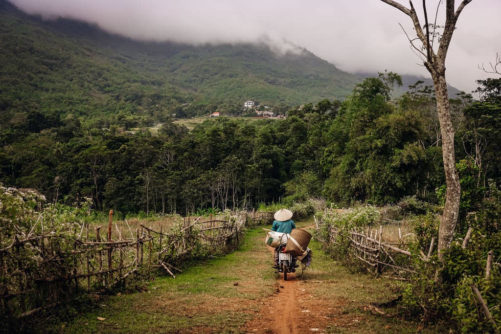 Navigating towards the rice fields, a Vietnamese rider dons the iconic conical hat, embodying the timeless spirit of rural life.